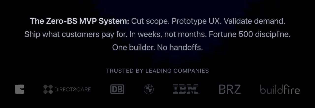 | Zero‑BS MVP System | Rapid MVP development using modern tech; clickable prototyping; demand validation | Speed to market; direct engineer collaboration; proven expertise | Designed for founders ready to invest; technical dependency on one engineer | Starting at €15,000 |
